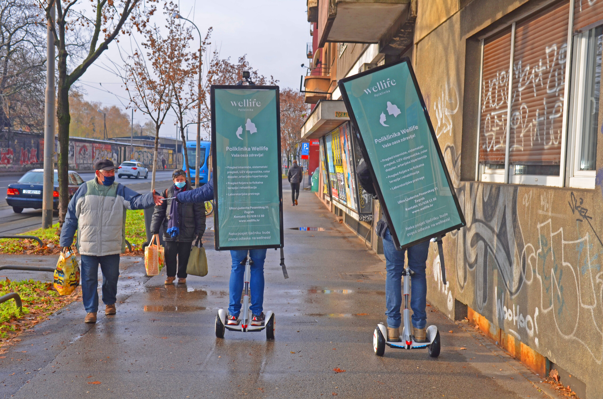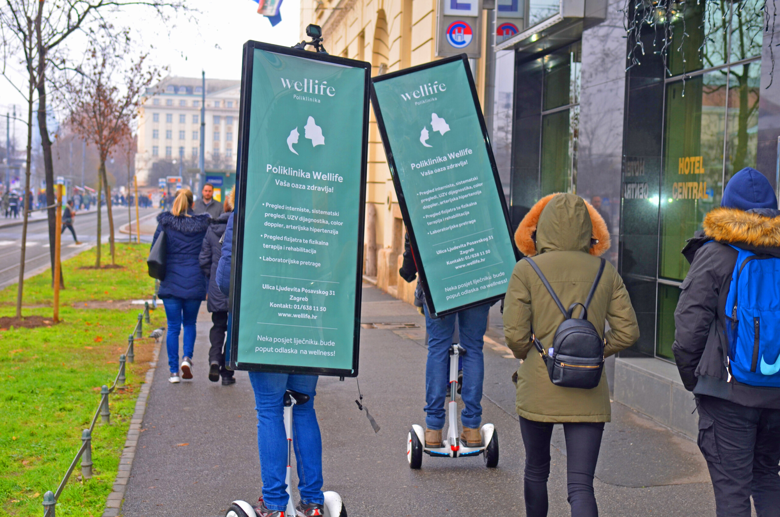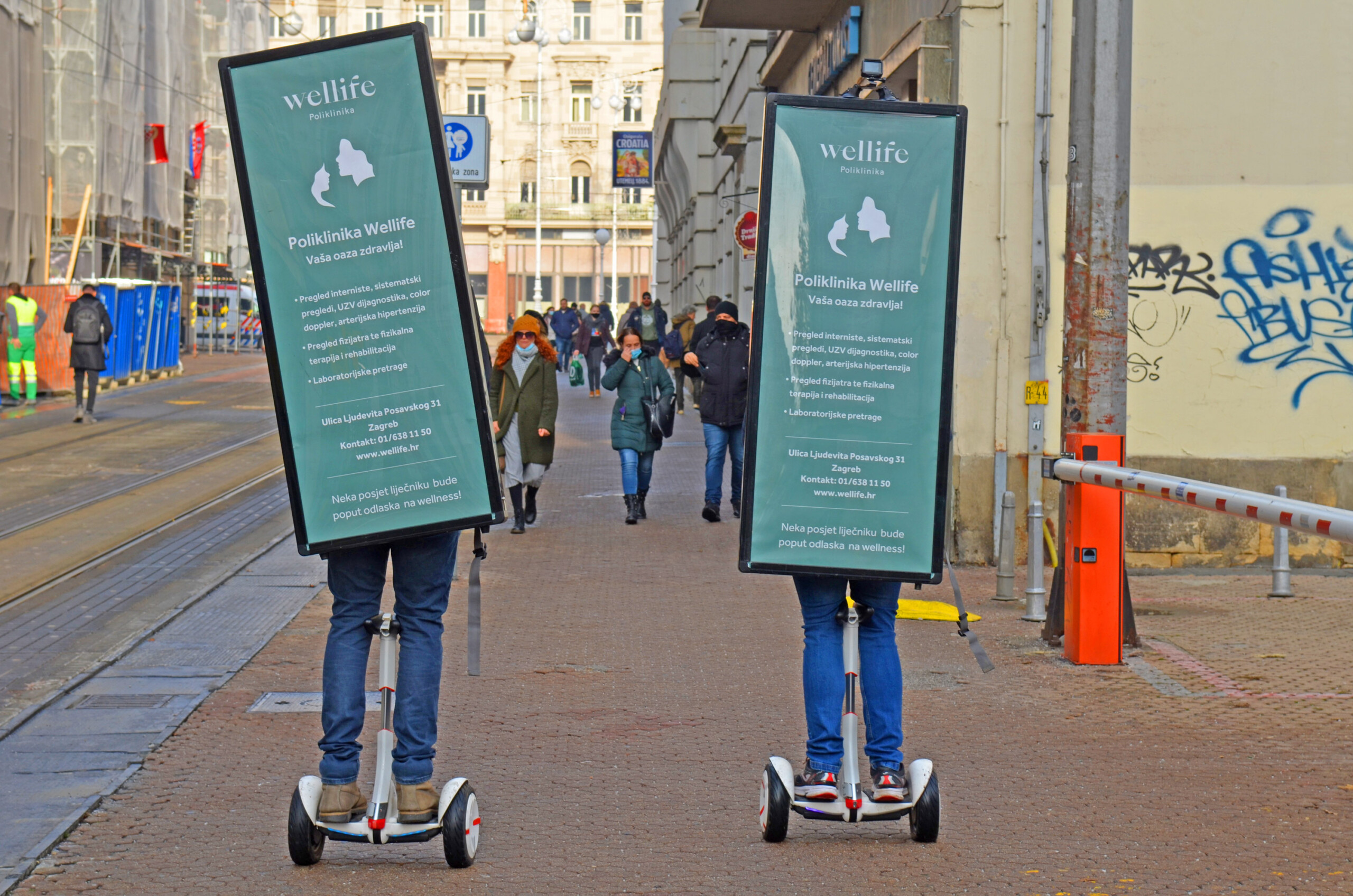 Kako bi se promoviralo otvorenje Poliklinike Wellife, iskorištena je Electric serija Hodajućih reklama, koja pruža izvrstan doseg te omogućava pokrivanje širokog prostora u kratkom vremenskom roku, na taj način osiguravajući veći broj impresija. Lokacijski se kampanja provodila na dvije lokacije, u samom centru kao najfrekventnijoj pješačkoj zoni i u neposrednoj blizini nove Poliklinike te obližnjoj Branimirovoj ulici, Aveniji Marina Držića i Heinzelovoj ulici.